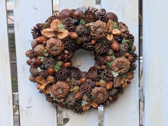 木の実のリース(松ぼっくりの輪・リバーシブル)は、外側には約15個の松ぼっくり、内側には約9個の松ぼっくりが施されていて二重構造になっています。 ガラスの扉や窓に飾る時、このリースはリバーシブル仕様なので、窓越しに見てもきれいです。リースを活用した飾り付けもバリエーション豊富に楽しめます。 全国各地で集めた10種類以上の木の実や大豆や小豆などが使用されております。 このリースがあなたの家に訪れる季節の変化や楽しい日々を彩りますように。ぜひ、お気に入りのアイテムとしてお迎えください。 品 番:【TW-02】 サイズ:直径約30㎝、内径約9㎝、高さ約8㎝あります。 ※壊れやすい商品です。取り扱いには注意してください。 ※天然素材を使用しているため、直射日光や高温多湿を避け、風通しの良い場所にて保管ください。 ※天然素材を使用していますので、作品は同じものは一つもありません。サンプル画像と実物のカラーに違いがある場合がございますがご容赦お願いいたします。