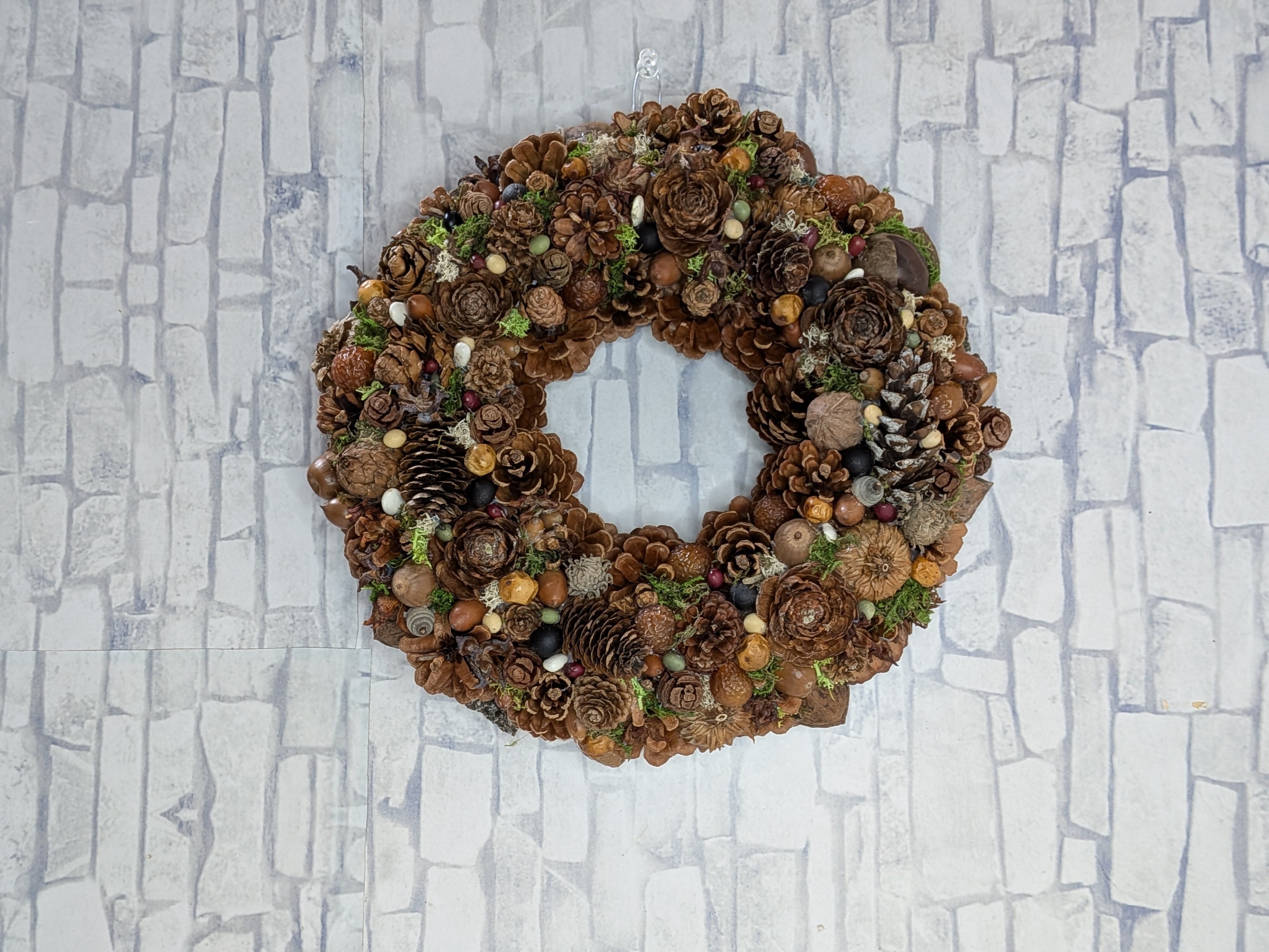 木の実のリース(松ぼっくりの輪・リバーシブル)は、外側には約15個の松ぼっくり、内側には約9個の松ぼっくりが施されていて二重構造になっています。