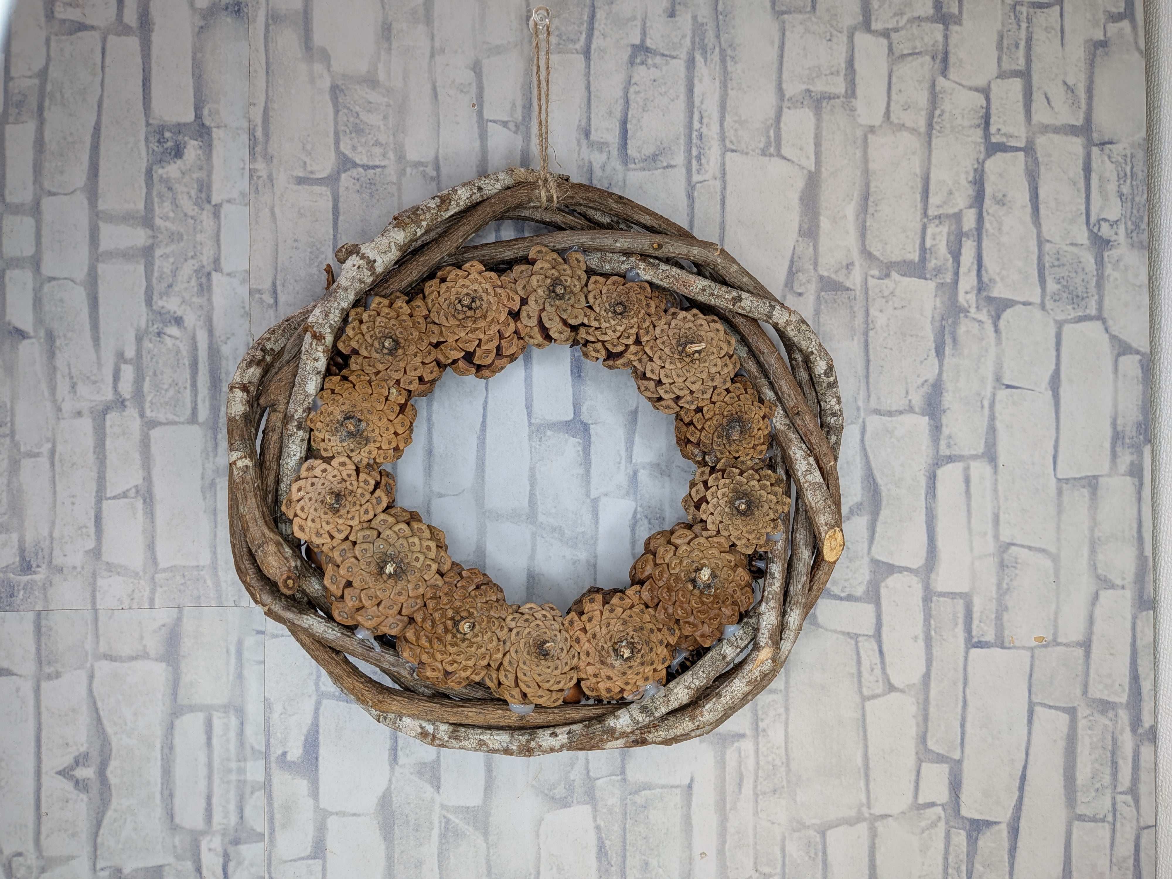 リース(二重仕様)①は、直径約20㎝~25㎝のサイズで、外側に藤のつる、内側に松ぼっくりをあしらった珍しいリースです。二重にしたデザインにより、立体感と華やかさを演出し、自然の温もりを感じられるインテリアとしてご活用いただけます。