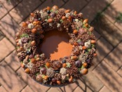 木の実のリースCは、少し大きめの自然素材のナチュラルリースで、スタイロホームの台に木の実を華やかに配置した作品で、直径約30cm 高さ約7cmと存在感のあるリースです。