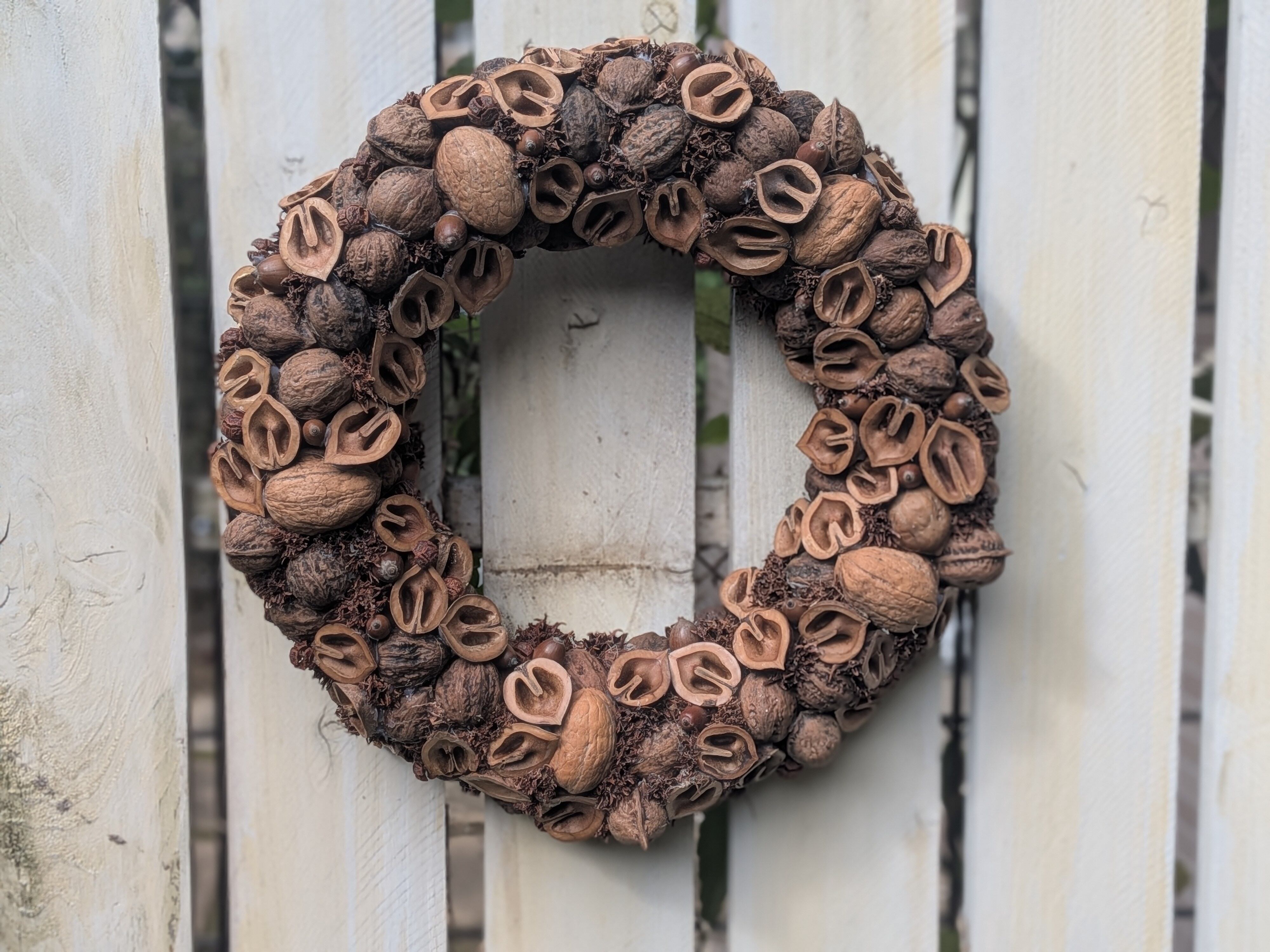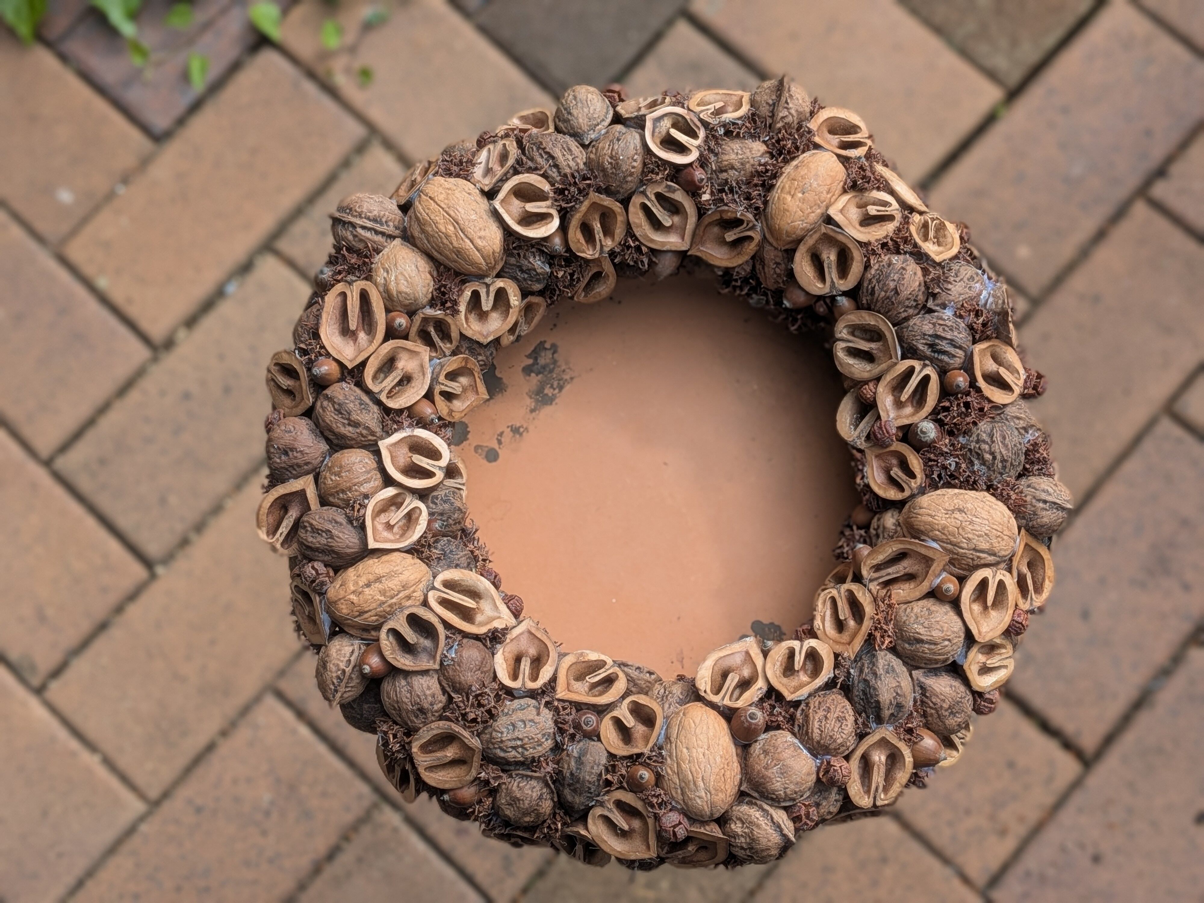 クルミのみのリース G はスタイロフォームの台の上にクルミの実を美しく配し、実を裏表で配置していて、特徴的で、見る人の心を惹きつけます。直径約30cmの大型リースは、存在感がありつつも、どこか落ち着いた雰囲気を醸し出します。リボンをつければ、一瞬でクリスマスリースに変身し、季節ごとの特別な空間を演出します。作者が全国各地で集めた自然素材を生かしたこのリースは、玄関に飾るだけでなく、リビングやダイニングにもぴったり。訪れる人々に暖かい歓迎の気持ちを伝え、心地よいひとときを提供します。クルミの実の持つ素朴ながらも高雅な風情は、日常の喧騒から心を解き放ち、心安らぐ空間を作り出します。季節ごとの変化を楽しみたい方、自然を愛する方に特におすすめです。