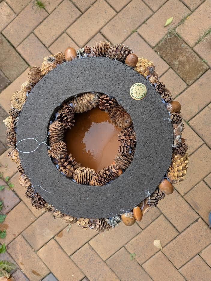 木の実のリース 大 は、自然素材のナチュラルリースで、スタイロホームの台にアメリカ楓他、いろんな木の実を数種類配置した作品で、直径約30cm 高さ約6cmと存在感のあるリースです。