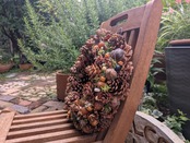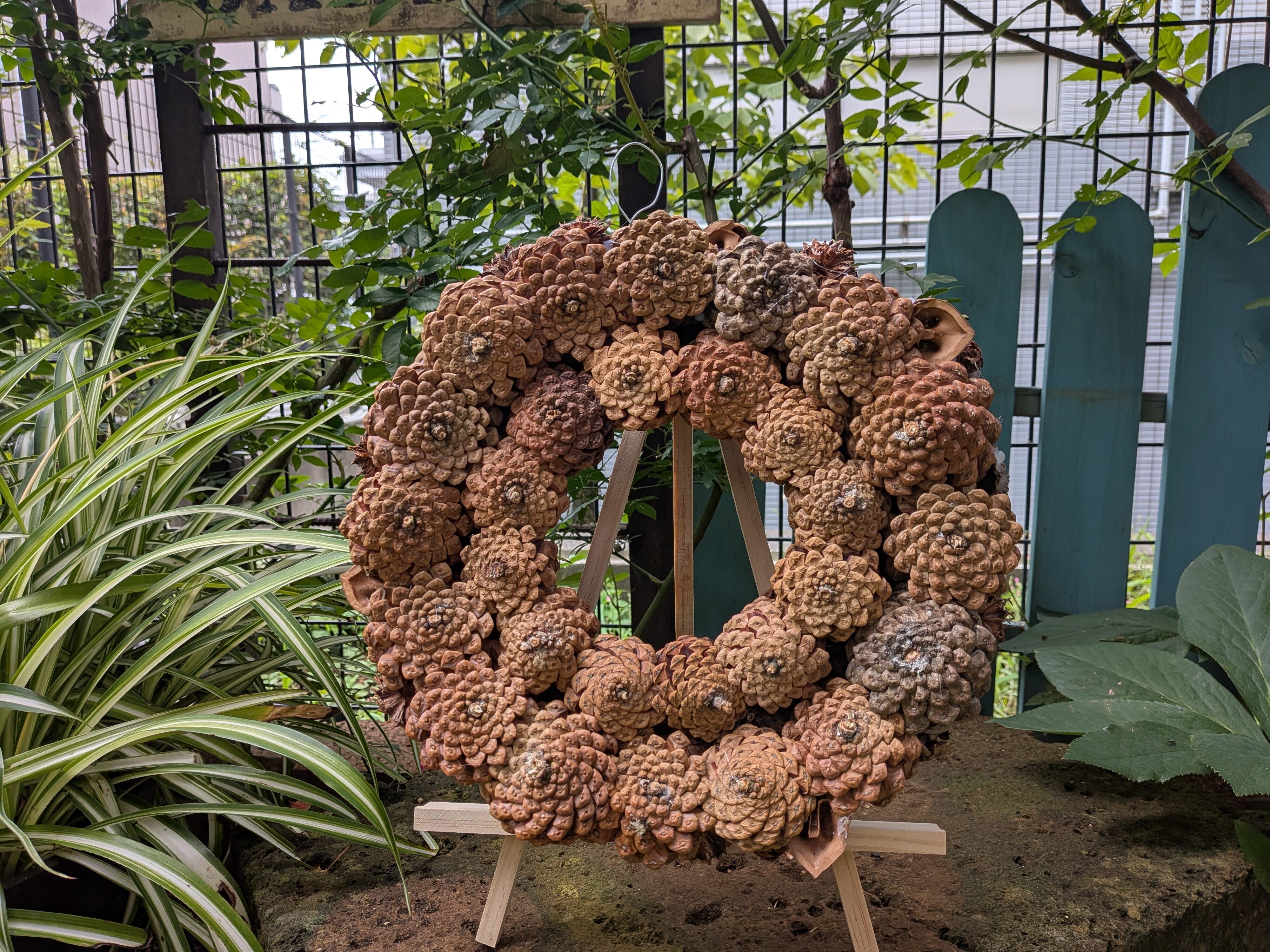 木の実のリース(松ぼっくりの輪・リバーシブル)は、外側には約15個の松ぼっくり、内側には約9個の松ぼっくりが施されていて二重構造になっています。