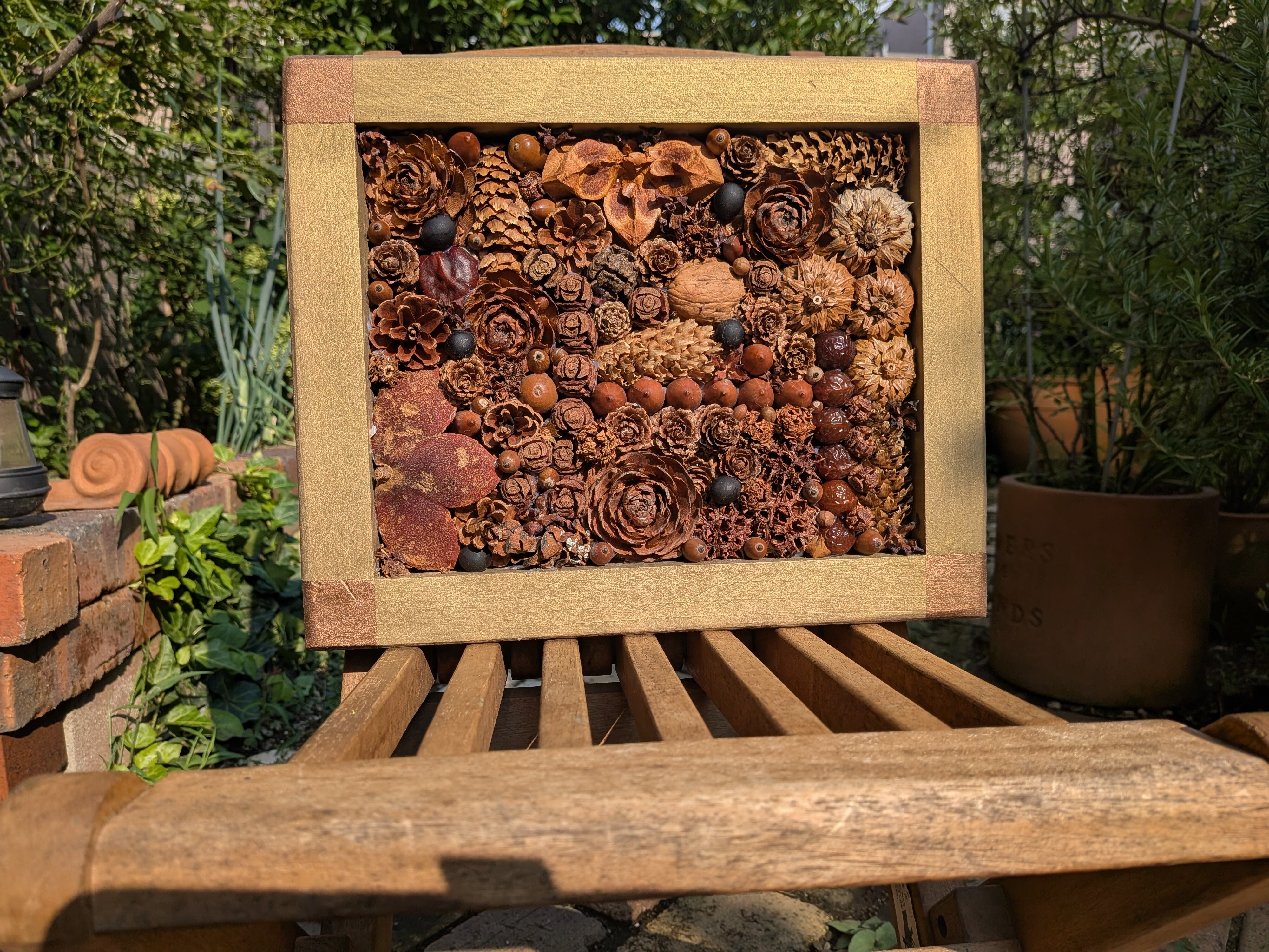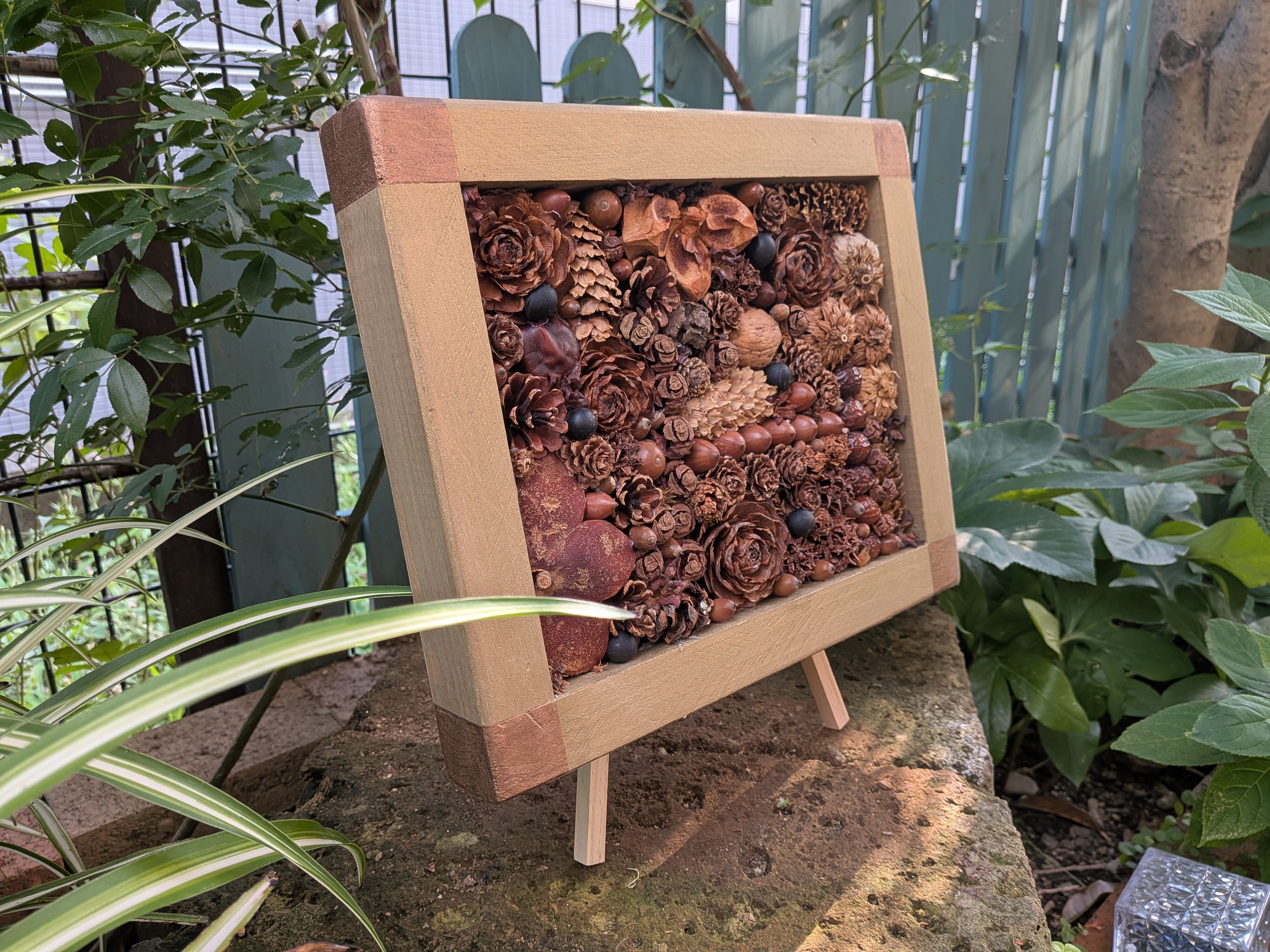 木の実にはそれぞれ個性があり、自然の温もりを感じさせてくれます。額縁の色はライトゴールドです。