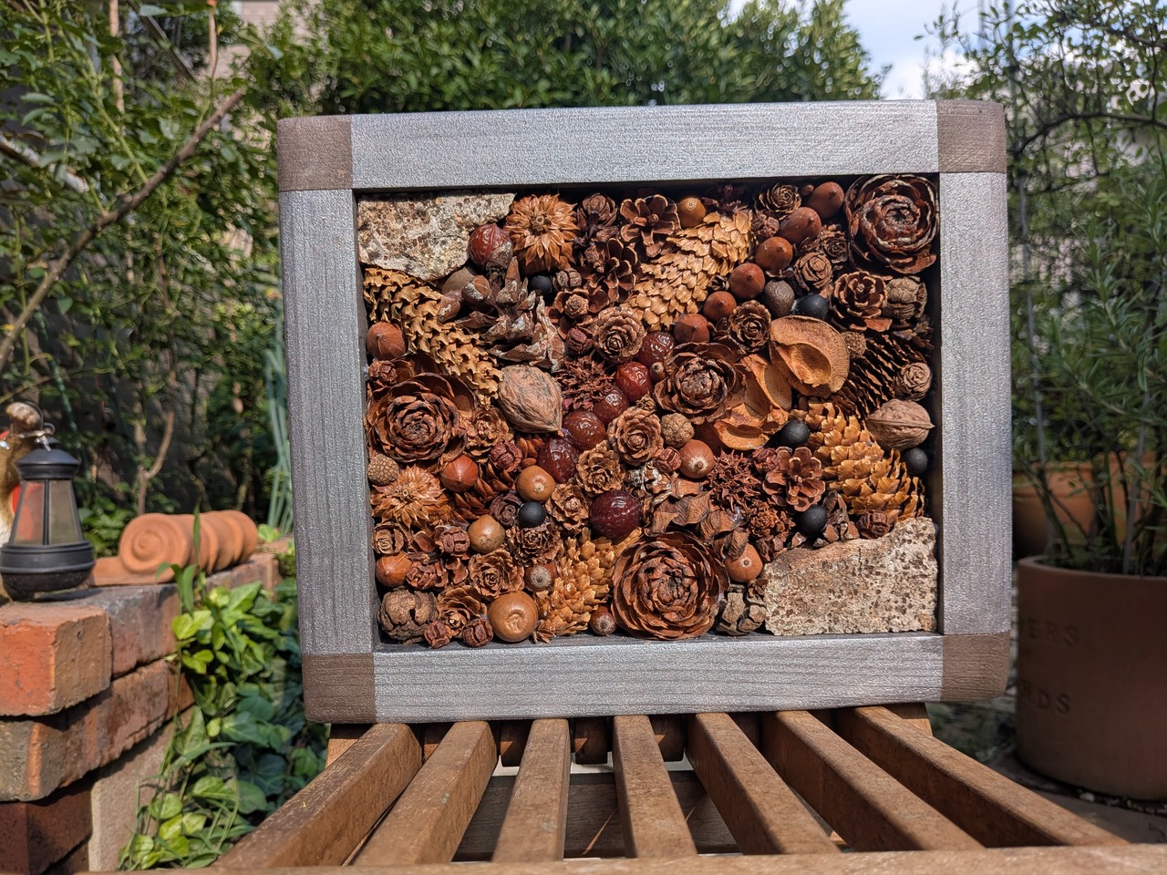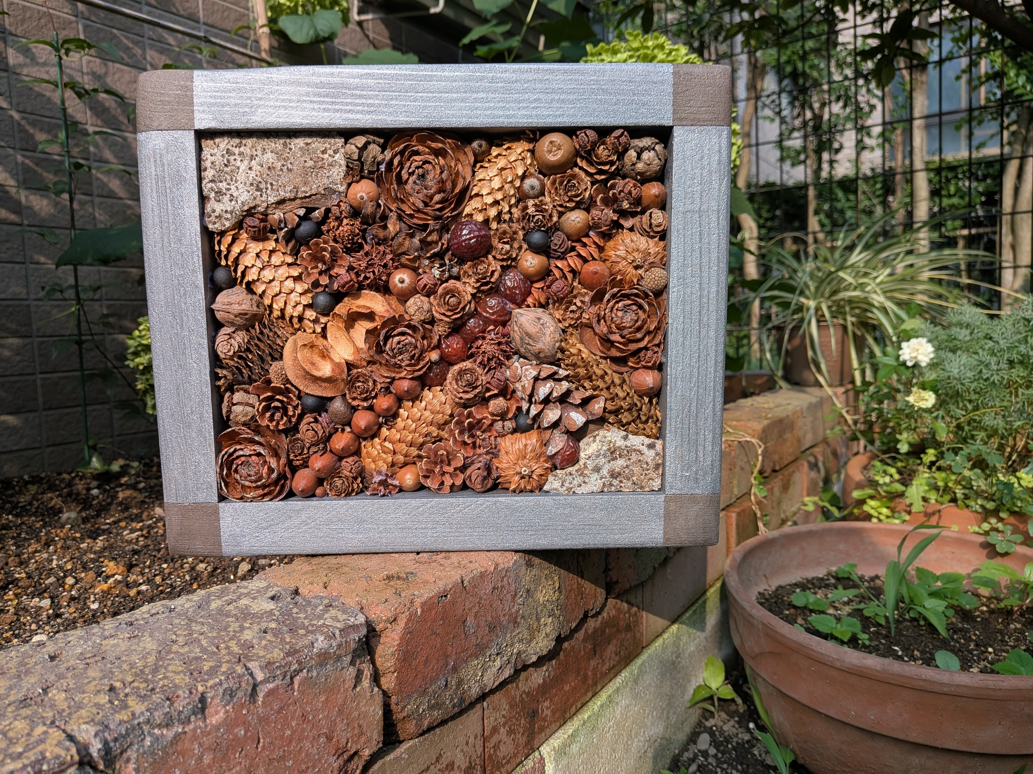 木の実のパレット(アンティークシルバー)①は、全国各地で集めた約10種類の国産木の実をふんだんに使い、額縁も含め、一つ一つ手作りで作りました。